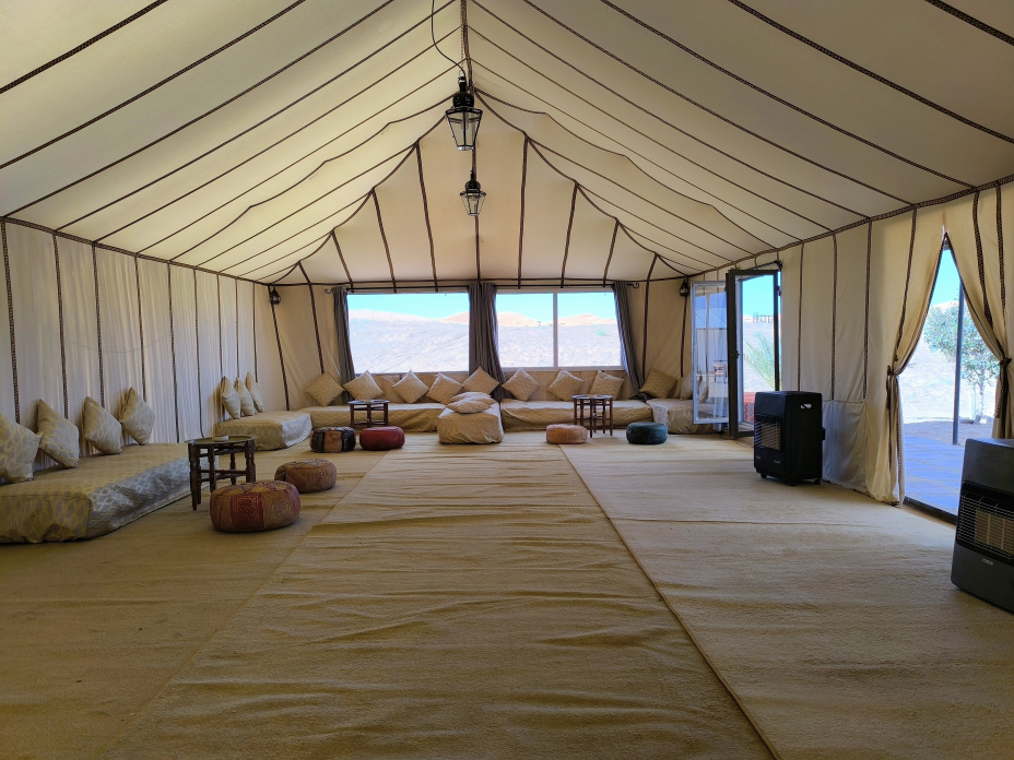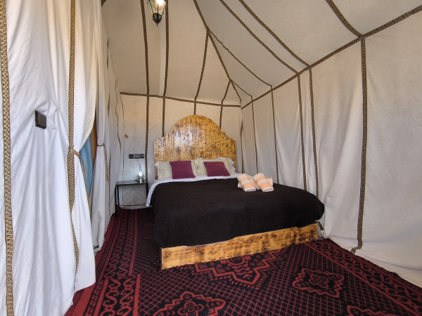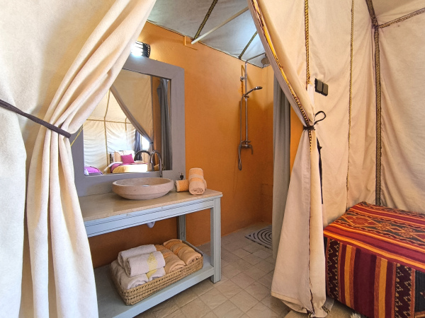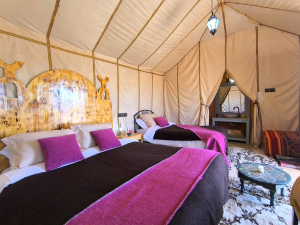 Capacity for 1, 2 or 3 people, double bed or two single beds. Suite bathroom. Our camp has beberer-style private tents, incredibly comfortable, as well as including luxury items, such as electricity, heating and hot water in the middle of the desert. Suite bathroom with hot and cold shower and toilet. Heating. The materials used for each tent have been handmade in Morocco. Each jaima has electricity and heating generated by solar panels. European style plugs.