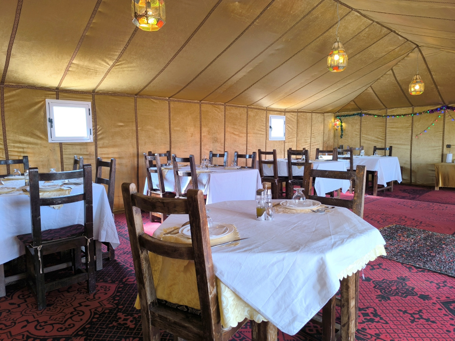 With an elegant and cozy style in the restaurant you can taste the traditional Moroccan flavors served with a different menu every day. You will enjoy an unforgettable dinner and an excellent breakfast to start a great day in the middle of the desert. We do not sell alcoholic beverages but we invite you to bring your own drink that we will gladly serve you. If you need a special diet let us know and we will adapt to your needs.